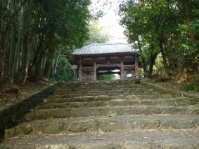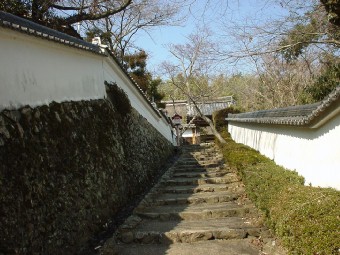 周囲が明るくなり、眺望が開けます。勝持寺はもうすぐそこです。 最後の石段は、左手が白壁に沿って続き、目前に小さな門が見えてきます。壁の向こうからは、桜が枝を突き出して、 「これが花の盛りなら、どんなにか美しいだろうなあ 」と、期待を持たせるような、憎い演出の入り口です。